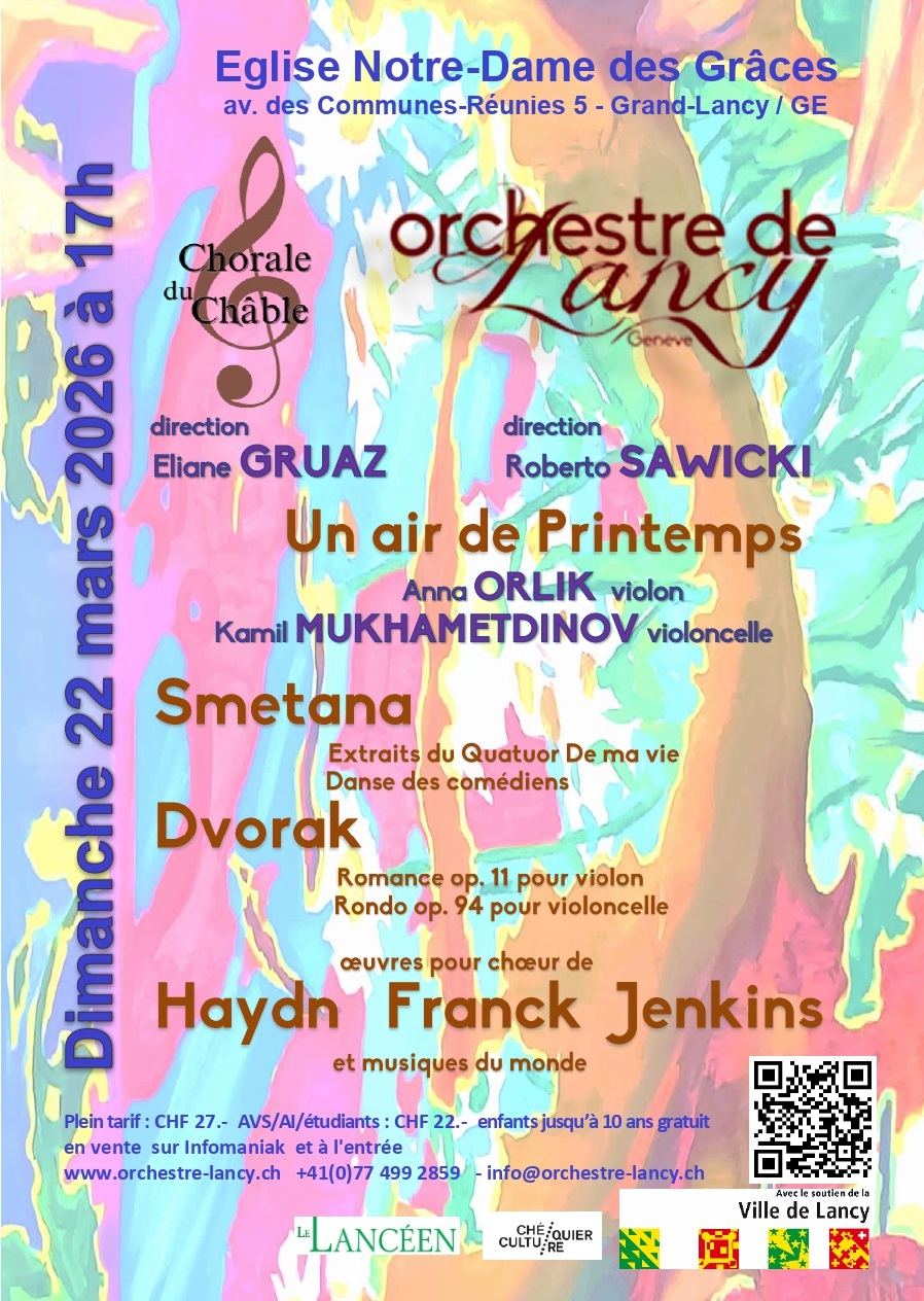 La Chorale du Châble, chœur mixte regroupant une soixantaine de membres, est dirigée depuis 1994 par Eliane Gruaz, sœur du fondateur Jean François Metral. Elle est appréciée pour son style chaleureux et son répertoire éclectique qui comprend aussi bien des œuvres classiques sacrées et profanes que celles de compositeurs contemporains parfois peu connus, dont les œuvres sont données en création. Le folklore étranger, la chanson française et les negro-spirituals en font partie pour le plus grand bonheur des choristes et du public que cette variété réjouit. Pour cette nouvelle collaboration avec l’Orchestre de Lancy-Genève la pianiste Nelly Gruaz a préparé les transcriptions pour orchestre.